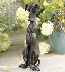 Garden Dog. This cast-iron canine was created to provide a lifetime of loveliness. Designed with tons of personality, he sits patiently on porches, patios, and in gardens with an irresistible, "please pet me" posture. Firmly balanced by a curled tail and finished in the rich chocolate tones of a purebred. Size 17"H x 7-1/4"W